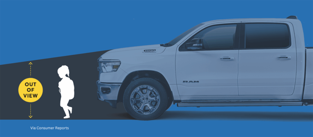 The scariest part of about this image is that most trucks sold today are bigger than shown here. I swear some of their squared-off grills are five feet to the top! The black truck shown next to the Civic at the top of this post is notably taller than the white one in this illustration. Look at the difference in clearance under the front bumper. It has notably less ability to see anything in front of it!