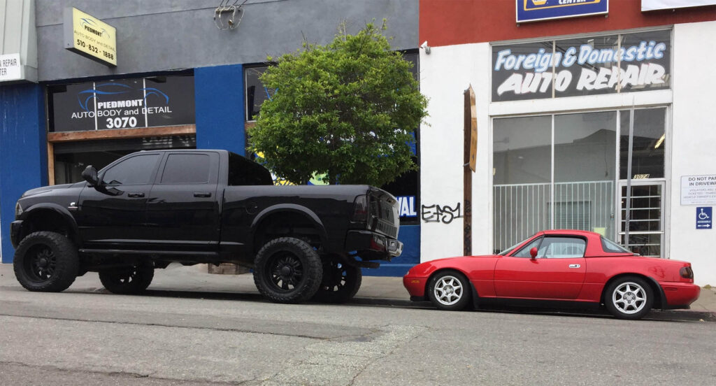 As someone who wants a Miata when it's finally time to get rid of my current car, images like this make me shake my head in annoyance and fear. This isn't my car or even the right brand or model, but it's about the right size, and it's dwarfed by most pickups on the road these days. And Miatas are even smaller!