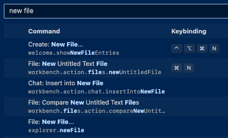 It's not a difficult fix; I just didn't bother to even look for one. We'll be editing keyboard shortcuts to accomplish this, so hit Cmd-Shift-P to open up the command panel and then type "key" to pare down the list. Select the one that says "Preferences: Open Keyboard Shortcuts", and in the search box put "new file" to find relevant shortcuts.